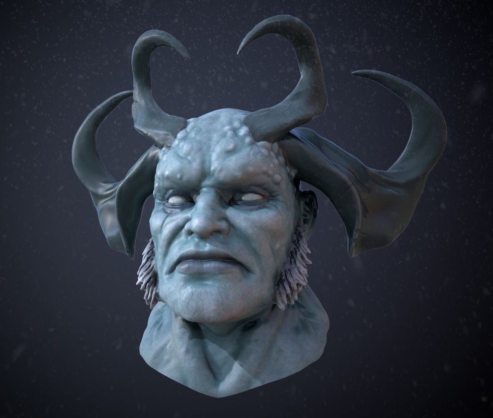 The Ice Giant is my take on a D&D Frost Giant that lives in the harsh icy tundras. Completely blind from the elements, it relies on its keen sense of smell to track down prey. Fully sculpted in Zbrush starting from a sphere. Then retopologized and UV'd in Maya. Created PBR textures in Substance Painter and final render was done in Marmoset.